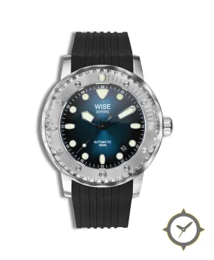 Eine Taucheruhr-Uhr mit einem markanten 42mm Auftritt am Handgelenk, gefertigt aus Edelstahl mit einem Zifferblatt in blau und einer besonderen "sunburst gradient"-Oberfläche.