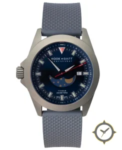 Eine Nautisch-Uhr mit einem markanten 45mm Auftritt am Handgelenk, gefertigt aus Titan mit einem Zifferblatt in blau und einer besonderen "sunburst"-Oberfläche und einer wunderschönen Mondphasenanzeige.