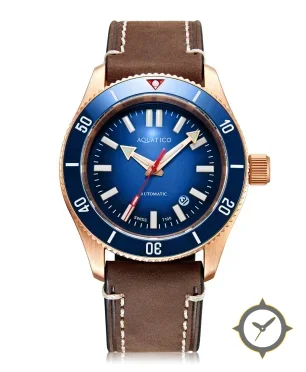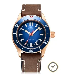 Eine Taucheruhr-Uhr mit einem vielseitigen 40mm Gehäuse, das an fast jedes Handgelenk passt, gefertigt aus Bronze mit einem Zifferblatt in blau und einer besonderen "sunburst"-Oberfläche.