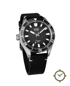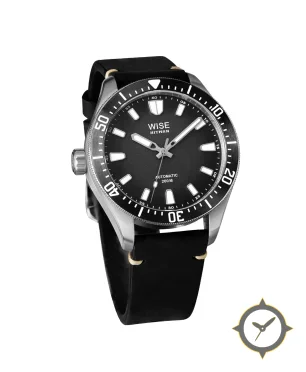 Eine Taucheruhr-Uhr mit einem markanten 46mm Auftritt am Handgelenk, gefertigt aus Edelstahl mit einem Zifferblatt in schwarz und einer besonderen "matte/grain"-Oberfläche.