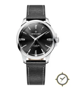 Eine Dress-Uhr mit einem 31.5mm Gehäuse im Vintage-Stil gefertigt aus Edelstahl mit einem Zifferblatt in schwarz und einer besonderen "sunburst"-Oberfläche.