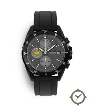 Eine Chronograph-Uhr mit einem markanten 46mm Auftritt am Handgelenk, gefertigt aus Edelstahl mit einem Zifferblatt in grau und einer besonderen "matte"-Oberfläche und einer echten GMT-Funktion, mit der du eine zweite Zeitzone verfolgen kannst.
