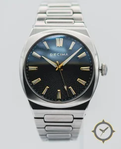 Eine Luxus-Uhr mit einem vielseitigen 39mm Gehäuse, das an fast jedes Handgelenk passt, gefertigt aus Edelstahl mit einem Zifferblatt in blau und einer besonderen "guilloché / hobnail with gradient (blue to black)"-Oberfläche.