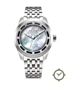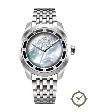 Eine Dress-Uhr mit einem 37mm Gehäuse im Vintage-Stil gefertigt aus Edelstahl mit einem Zifferblatt in grau und einer besonderen "mother-of-pearl (iridescent)"-Oberfläche.