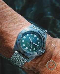 Eine Taucheruhr-Uhr mit einem 36.5mm Gehäuse im Vintage-Stil gefertigt aus Edelstahl mit einem Zifferblatt in grün und einer besonderen "matte"-Oberfläche.