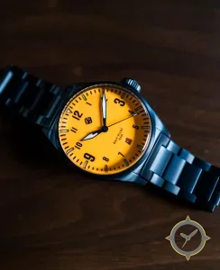 Eine Pilot-Uhr mit einem vielseitigen 38.5mm Gehäuse, das an fast jedes Handgelenk passt, gefertigt aus Edelstahl mit einem Zifferblatt in orange und einer besonderen "matte"-Oberfläche.