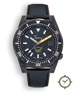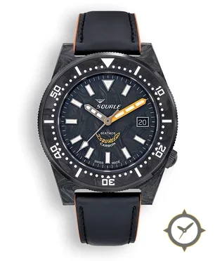 Eine Taucheruhr-Uhr mit einem markanten 45mm Auftritt am Handgelenk, gefertigt aus Carbon mit einem Zifferblatt in marineblau und einer besonderen "marbled/forged-carbon texture"-Oberfläche.