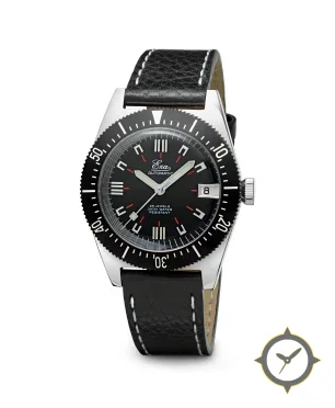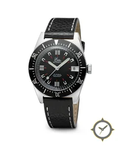 Eine Vintage-Uhr mit einem 36.5mm Gehäuse im Vintage-Stil gefertigt aus Edelstahl mit einem Zifferblatt in schwarz und einer besonderen "matte"-Oberfläche.