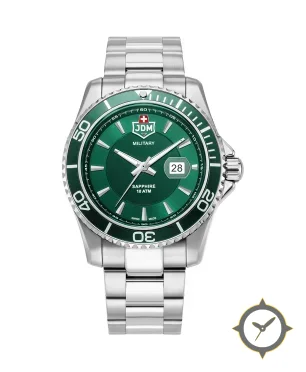 Eine Taucheruhr-Uhr mit einem markanten 51mm Auftritt am Handgelenk, gefertigt aus Edelstahl mit einem Zifferblatt in grün und einer besonderen "sunburst"-Oberfläche.
