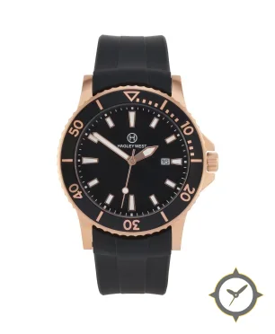 Eine Taucheruhr-Uhr mit einem vielseitigen 39mm Gehäuse, das an fast jedes Handgelenk passt, gefertigt aus Gold mit einem Zifferblatt in schwarz und einer besonderen "matte"-Oberfläche.