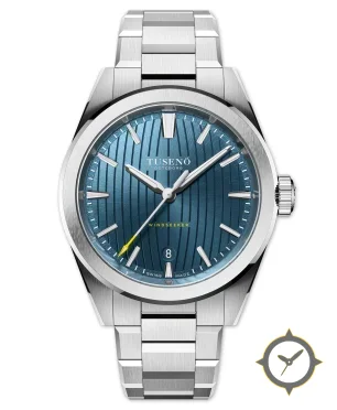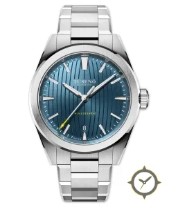 Eine Sport-Uhr mit einem markanten 45mm Auftritt am Handgelenk, gefertigt aus Edelstahl mit einem Zifferblatt in blau und einer besonderen "vertical wave / striped guilloche"-Oberfläche.