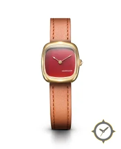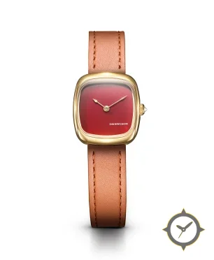 Eine Dress-Uhr mit einem 25.5mm Gehäuse im Vintage-Stil gefertigt aus Gold mit einem Zifferblatt in rot und einer besonderen "lacquer"-Oberfläche.