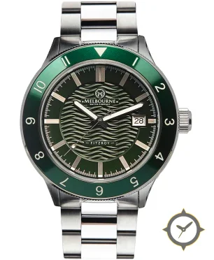 Eine Taucheruhr-Uhr mit einem vielseitigen 40mm Gehäuse, das an fast jedes Handgelenk passt, gefertigt aus Edelstahl mit einem Zifferblatt in grün und einer besonderen "wavy"-Oberfläche.