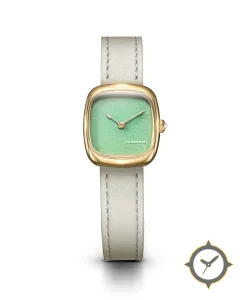 Eine Dress-Uhr mit einem 23mm Gehäuse im Vintage-Stil gefertigt aus Gold mit einem Zifferblatt in grün und einer besonderen "textured (suede/grain)"-Oberfläche.