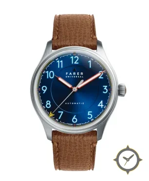 Eine Field-Uhr mit einem markanten 42mm Auftritt am Handgelenk, gefertigt aus Edelstahl mit einem Zifferblatt in blau und einer besonderen "sunburst"-Oberfläche.