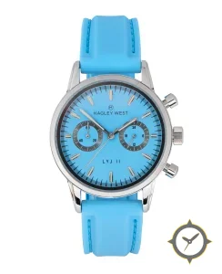 Eine Chronograph-Uhr mit einem 37mm Gehäuse im Vintage-Stil gefertigt aus Edelstahl mit einem Zifferblatt in blau und einer besonderen "sunburst"-Oberfläche.