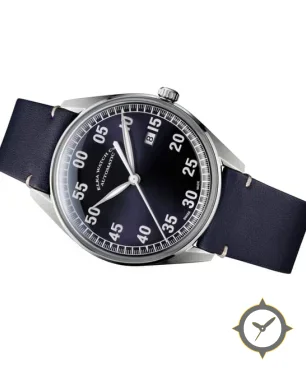 Eine Pilot-Uhr mit einem 35.5mm Gehäuse im Vintage-Stil gefertigt aus Edelstahl mit einem Zifferblatt in marineblau und einer besonderen "sunburst"-Oberfläche.