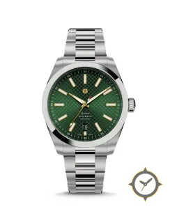 Eine Sport-Uhr mit einem vielseitigen 40mm Gehäuse, das an fast jedes Handgelenk passt, gefertigt aus Edelstahl mit einem Zifferblatt in grün und einer besonderen "lattice / crosshatch textured (guilloché-style)"-Oberfläche.