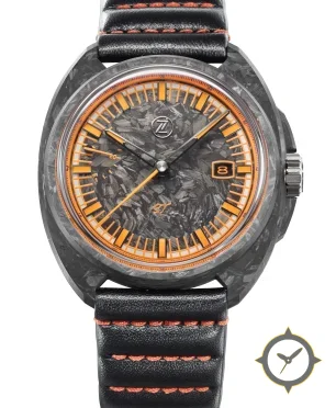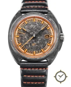 Eine Racing-Uhr mit einem vielseitigen 40.5mm Gehäuse, das an fast jedes Handgelenk passt, gefertigt aus Carbon mit einem Zifferblatt in grau und einer besonderen "forged carbon / marbled texture"-Oberfläche und einer praktischen Gangreserveanzeige.