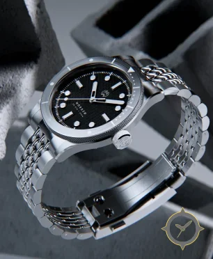Eine Taucheruhr-Uhr mit einem vielseitigen 41mm Gehäuse, das an fast jedes Handgelenk passt, gefertigt aus Edelstahl mit einem Zifferblatt in schwarz und einer besonderen "textured waffle/grain (subtle raised grid)"-Oberfläche.