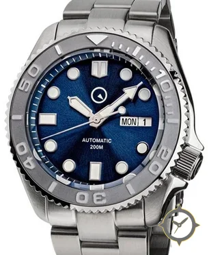 Eine Taucheruhr-Uhr mit einem markanten 47mm Auftritt am Handgelenk, gefertigt aus Edelstahl mit einem Zifferblatt in blau und einer besonderen "sunburst"-Oberfläche.