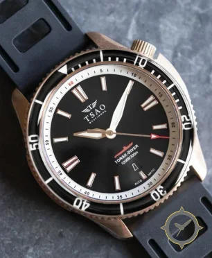 Eine Taucheruhr-Uhr mit einem 35.5mm Gehäuse im Vintage-Stil gefertigt aus Bronze mit einem Zifferblatt in schwarz und einer besonderen "matte"-Oberfläche.