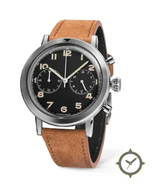 Eine Pilot-Uhr mit einem 34mm Gehäuse im Vintage-Stil gefertigt aus Edelstahl mit einem Zifferblatt in schwarz und einer besonderen "matte"-Oberfläche.