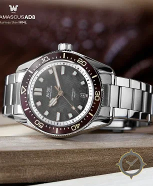 Eine Taucheruhr-Uhr mit einem markanten 42mm Auftritt am Handgelenk, gefertigt aus Edelstahl mit einem Zifferblatt in grau und einer besonderen "textured (chevron/wave)"-Oberfläche.