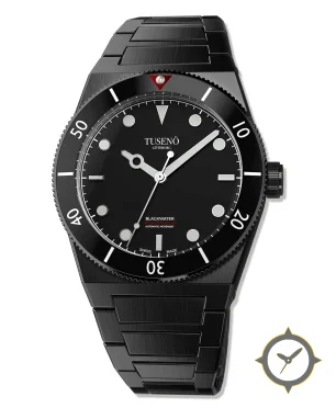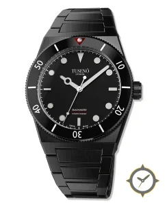 Eine Taucheruhr-Uhr mit einem markanten 46mm Auftritt am Handgelenk, gefertigt aus Edelstahl mit einem Zifferblatt in schwarz und einer besonderen "matte"-Oberfläche.