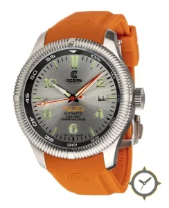 Eine Taucheruhr-Uhr mit einem markanten 45mm Auftritt am Handgelenk, gefertigt aus Edelstahl mit einem Zifferblatt in silber und einer besonderen "sunburst (radial brushed)"-Oberfläche.
