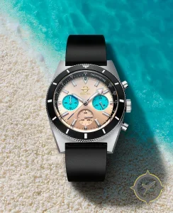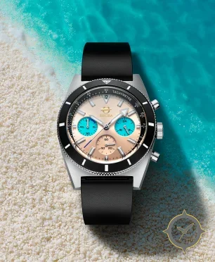 Eine Chronograph-Uhr mit einem 34mm Gehäuse im Vintage-Stil gefertigt aus Edelstahl mit einem Zifferblatt in gold und einer besonderen "sunburst / brushed"-Oberfläche.