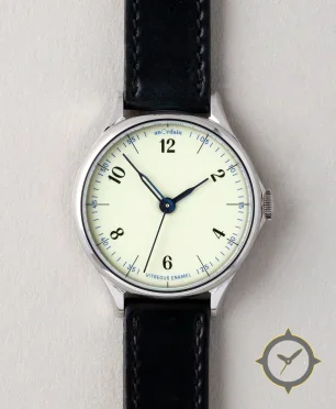 Eine Dress-Uhr mit einem 35mm Gehäuse im Vintage-Stil gefertigt aus Edelstahl mit einem Zifferblatt in weiß und einer besonderen "glossy vitreous enamel"-Oberfläche.