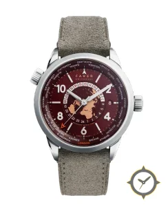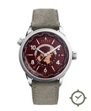 Eine Weltzeituhr-Uhr mit einem vielseitigen 39mm Gehäuse, das an fast jedes Handgelenk passt, gefertigt aus Edelstahl mit einem Zifferblatt in rot und einer besonderen "guilloché"-Oberfläche, ideal für Weltenbummler dank der Weltzeit-Funktion.