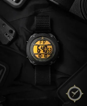 Eine Digital-Uhr mit einem markanten 48mm Auftritt am Handgelenk, gefertigt aus Titan mit einem Zifferblatt in orange und einer besonderen "segmented LCD"-Oberfläche.