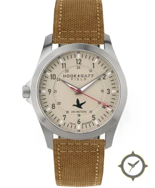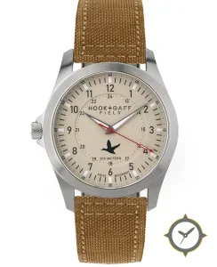 Eine Field-Uhr mit einem markanten 42.5mm Auftritt am Handgelenk, gefertigt aus Edelstahl mit einem Zifferblatt in weiß und einer besonderen "matte"-Oberfläche.