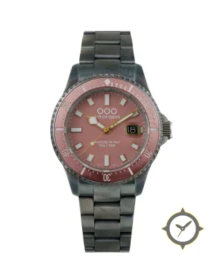 Eine Taucheruhr-Uhr mit einem markanten 43.5mm Auftritt am Handgelenk, gefertigt aus Edelstahl mit einem Zifferblatt in rot und einer besonderen "matte"-Oberfläche.