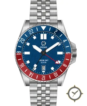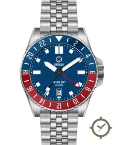 Eine GMT-Uhr mit einem markanten 45.5mm Auftritt am Handgelenk, gefertigt aus Edelstahl mit einem Zifferblatt in blau und einer besonderen "textured/grained"-Oberfläche und einer echten GMT-Funktion, mit der du eine zweite Zeitzone verfolgen kannst.