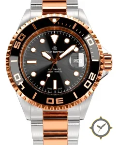 Eine Taucheruhr-Uhr mit einem 37mm Gehäuse im Vintage-Stil gefertigt aus Edelstahl mit einem Zifferblatt in schwarz und einer besonderen "sunburst"-Oberfläche.
