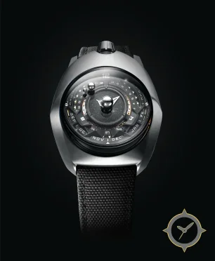Eine Luxus-Uhr mit einem 37mm Gehäuse im Vintage-Stil gefertigt aus Edelstahl mit einem Zifferblatt in schwarz und einer besonderen "sparkling/aventurine-like starfield with brushed concentric rings"-Oberfläche.