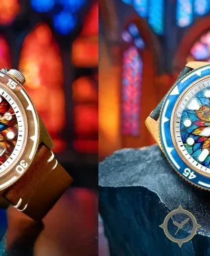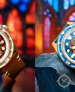 Eine Taucheruhr-Uhr mit einem 37mm Gehäuse im Vintage-Stil gefertigt aus Bronze mit einem Zifferblatt in blau und einer besonderen "stained-glass mosaic"-Oberfläche.