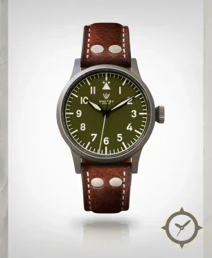 Eine Pilot-Uhr mit einem markanten 47mm Auftritt am Handgelenk, gefertigt aus Edelstahl mit einem Zifferblatt in grün und einer besonderen "matte"-Oberfläche.