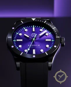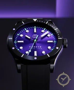 Eine Taucheruhr-Uhr mit einem vielseitigen 38.5mm Gehäuse, das an fast jedes Handgelenk passt, gefertigt aus Edelstahl mit einem Zifferblatt in lila und einer besonderen "sunburst (radial brushed)"-Oberfläche.