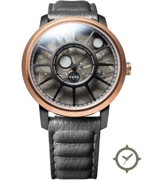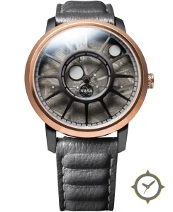 Eine Skelett-Uhr mit einem 35.5mm Gehäuse im Vintage-Stil gefertigt aus Gold mit einem Zifferblatt in grau und einer besonderen "meteorite-like textured, brushed metallic"-Oberfläche und einer wunderschönen Mondphasenanzeige.