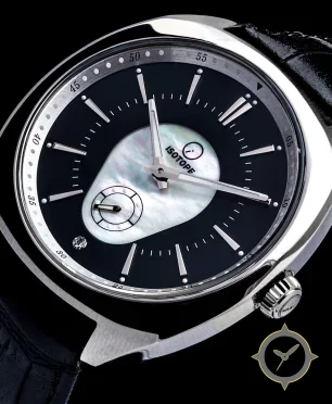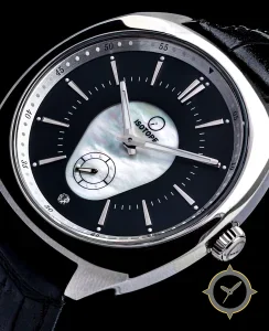 Eine Dress-Uhr mit einem 33mm Gehäuse im Vintage-Stil gefertigt aus Edelstahl mit einem Zifferblatt in schwarz und einer besonderen "matte black outer ring with mother-of-pearl central inlay"-Oberfläche.