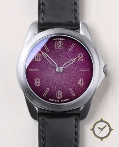 Eine Dress-Uhr mit einem markanten 45mm Auftritt am Handgelenk, gefertigt aus Edelstahl mit einem Zifferblatt in lila und einer besonderen "vitreous enamel with a slightly granular/textured finish"-Oberfläche.