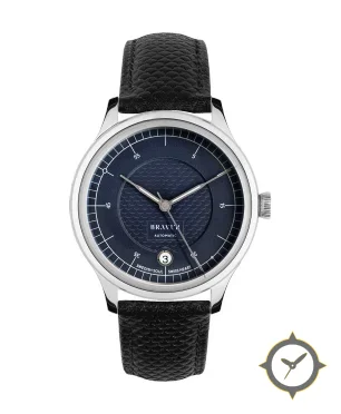 Eine Dress-Uhr mit einem markanten 41.5mm Auftritt am Handgelenk, gefertigt aus Edelstahl mit einem Zifferblatt in marineblau und einer besonderen "textured guilloché with small scale-like pattern"-Oberfläche.