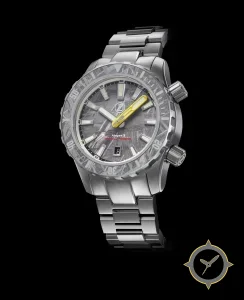 Eine Taucheruhr-Uhr mit einem 37mm Gehäuse im Vintage-Stil gefertigt aus Edelstahl mit einem Zifferblatt in grau und einer besonderen "meteorite texture (crystalline pattern)"-Oberfläche.