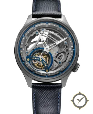 Eine Skelett-Uhr mit einem markanten 42mm Auftritt am Handgelenk, gefertigt aus Edelstahl mit einem Zifferblatt in grau und einer besonderen "skeletonized / open-work"-Oberfläche.