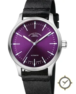Eine Minimalistisch-Uhr mit einem 37mm Gehäuse im Vintage-Stil gefertigt aus Edelstahl mit einem Zifferblatt in lila und einer besonderen "sunburst"-Oberfläche.