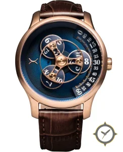 Eine Luxus-Uhr mit einem 35.5mm Gehäuse im Vintage-Stil gefertigt aus Gold mit einem Zifferblatt in blau und einer besonderen "guilloché (spiral wave texture)"-Oberfläche.